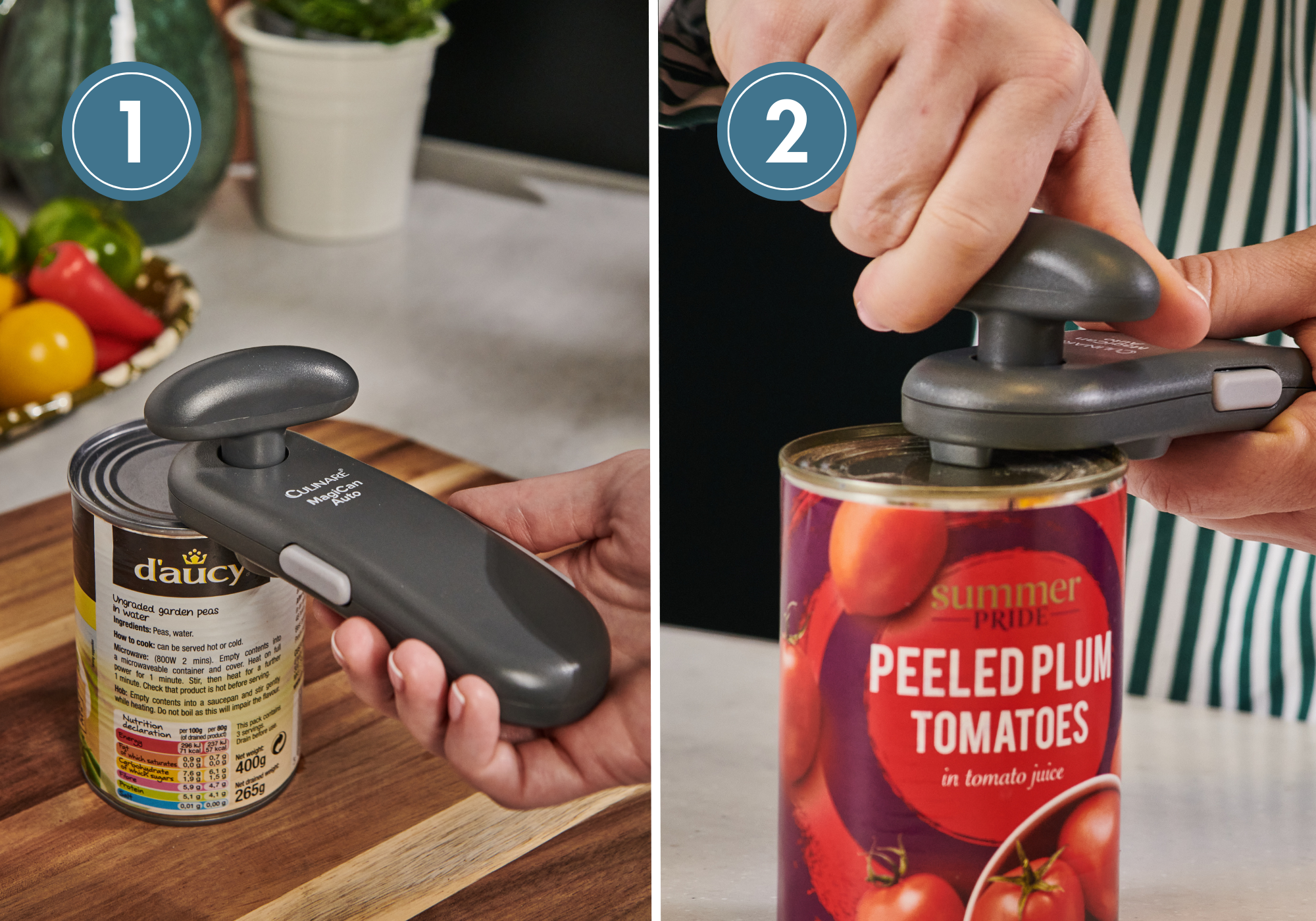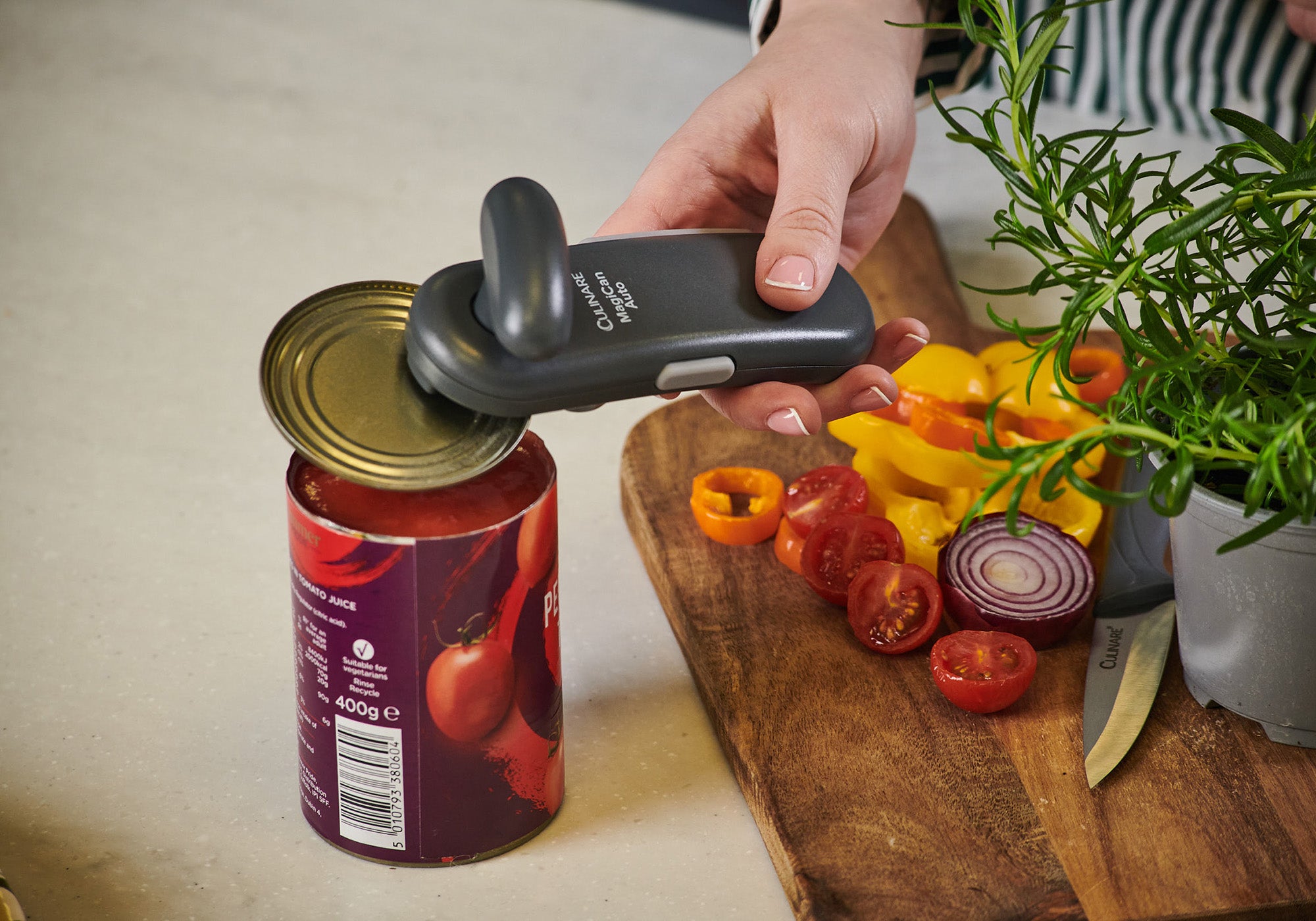 The Culinare Magican Auto combines functionality and ease, allowing you to open cans with one hand. Its patented cutting system and sturdy clamp mechanism ensure smooth, safe can opening for cans of most sizes. Equipped with wide ergonomic handles, a lightweight design, and a durable stainless steel cutting wheel, this opener provides maximum comfort and precision.
