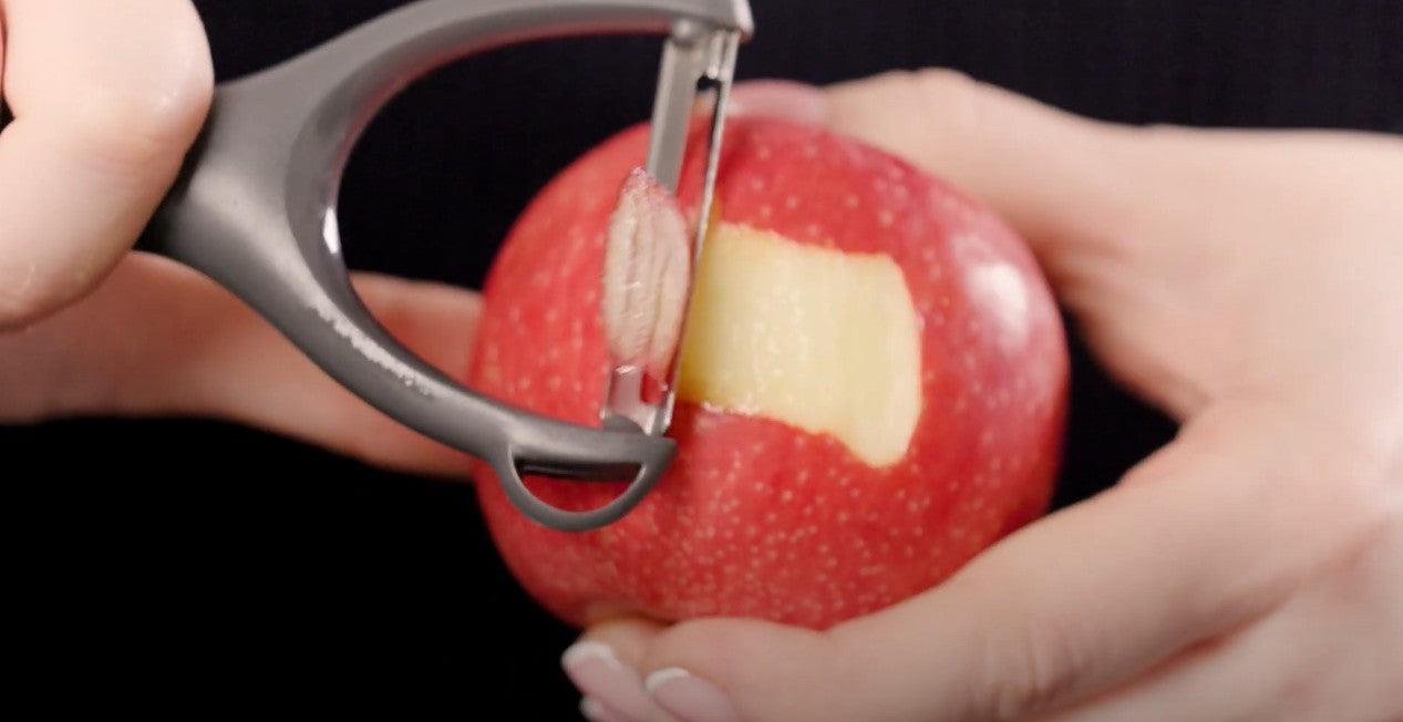 - The wide handle base offers balance, making it easier to guide the blade smoothly over the surface of fruits and vegetables.