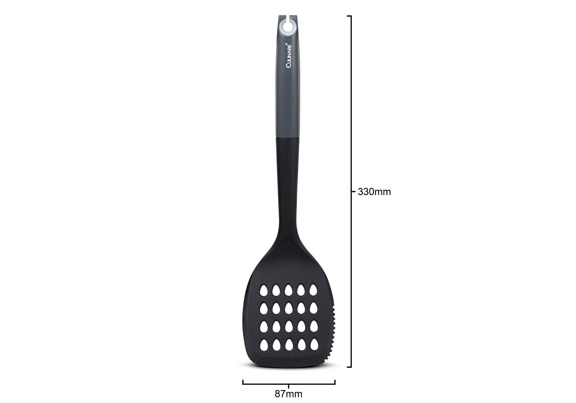 Whether you're flipping eggs, lifting flapjacks, or turning roast vegetables, this essential utensil is designed for effortless use on all types of non-stick and ceramic cookware. With its classic, durable design and a practical hanging hook for easy storage, it seamlessly fits into any kitchen setup. Built to last and dishwasher-safe, the Culinare Slotted Turner ensures smooth kitchen tasks, time and time again.
