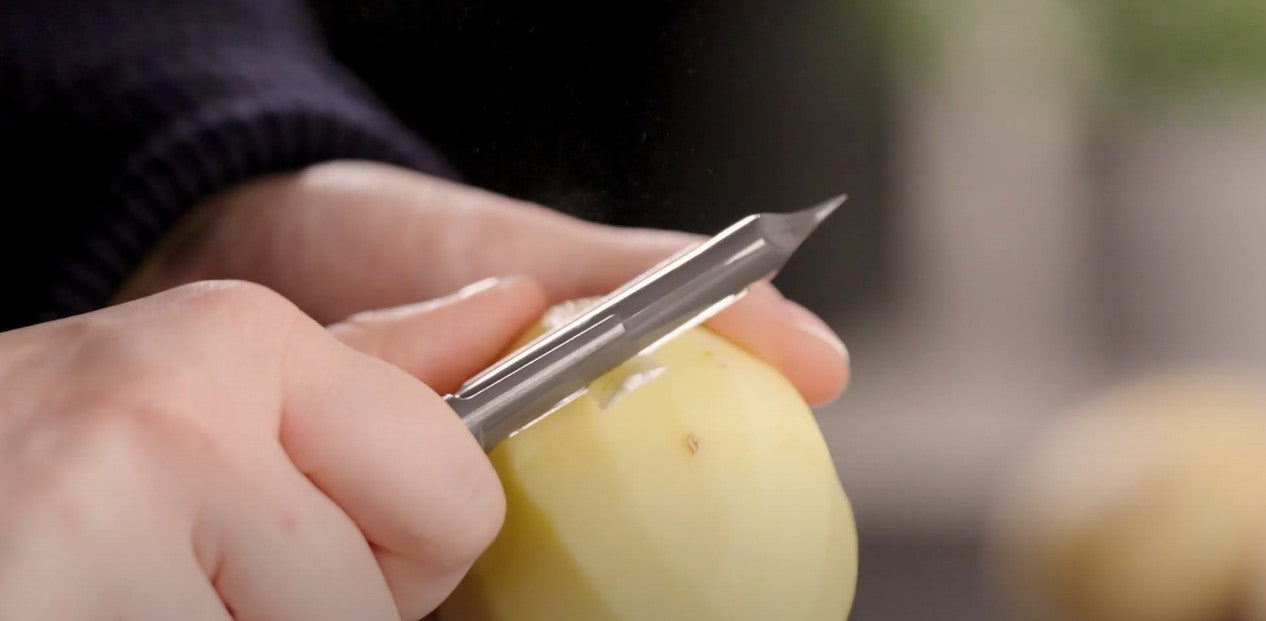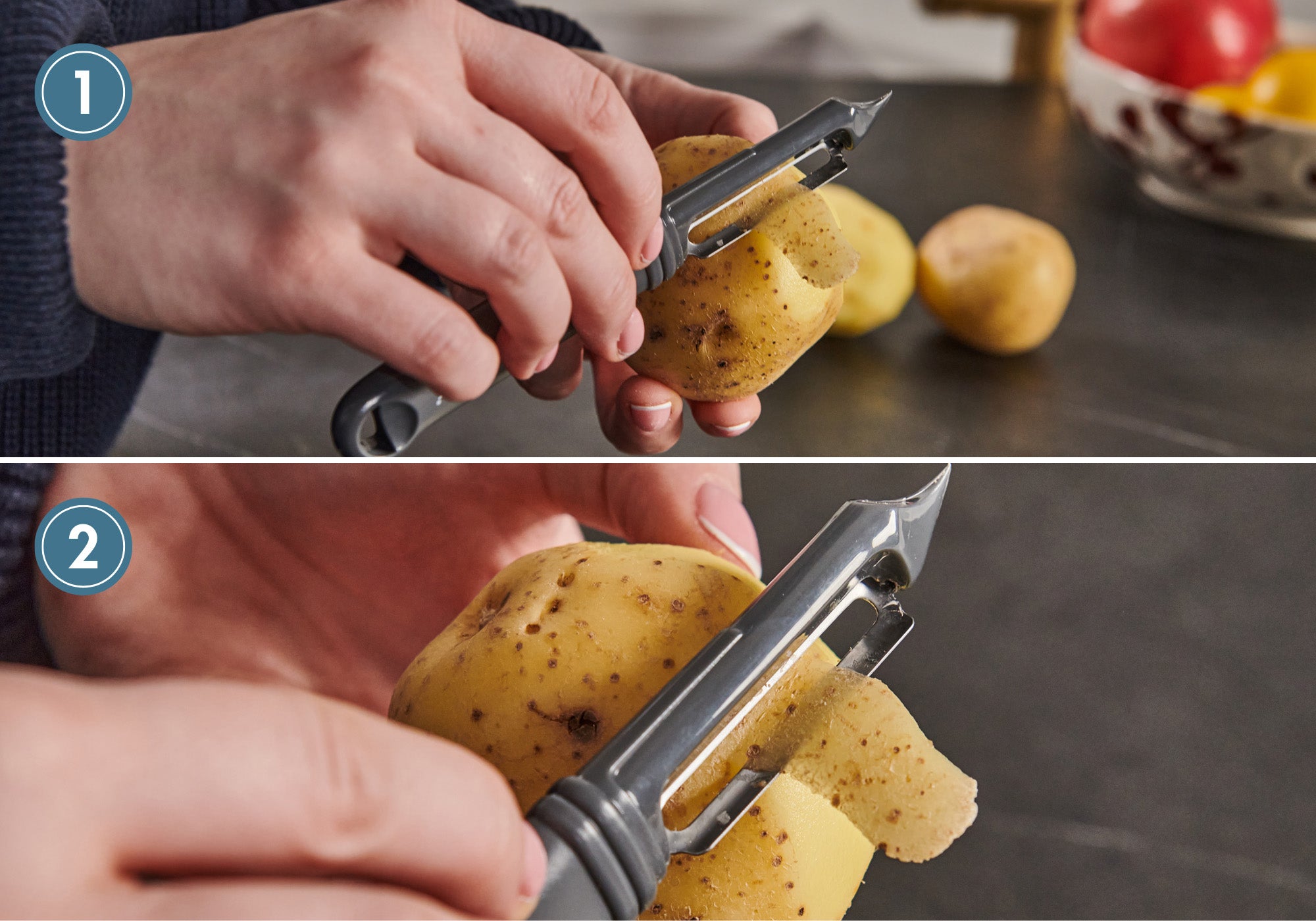 - Equipped with a blemish removal tool, ideal for both right- and left-handed users to quickly remove imperfections from potato and vegetable skins.